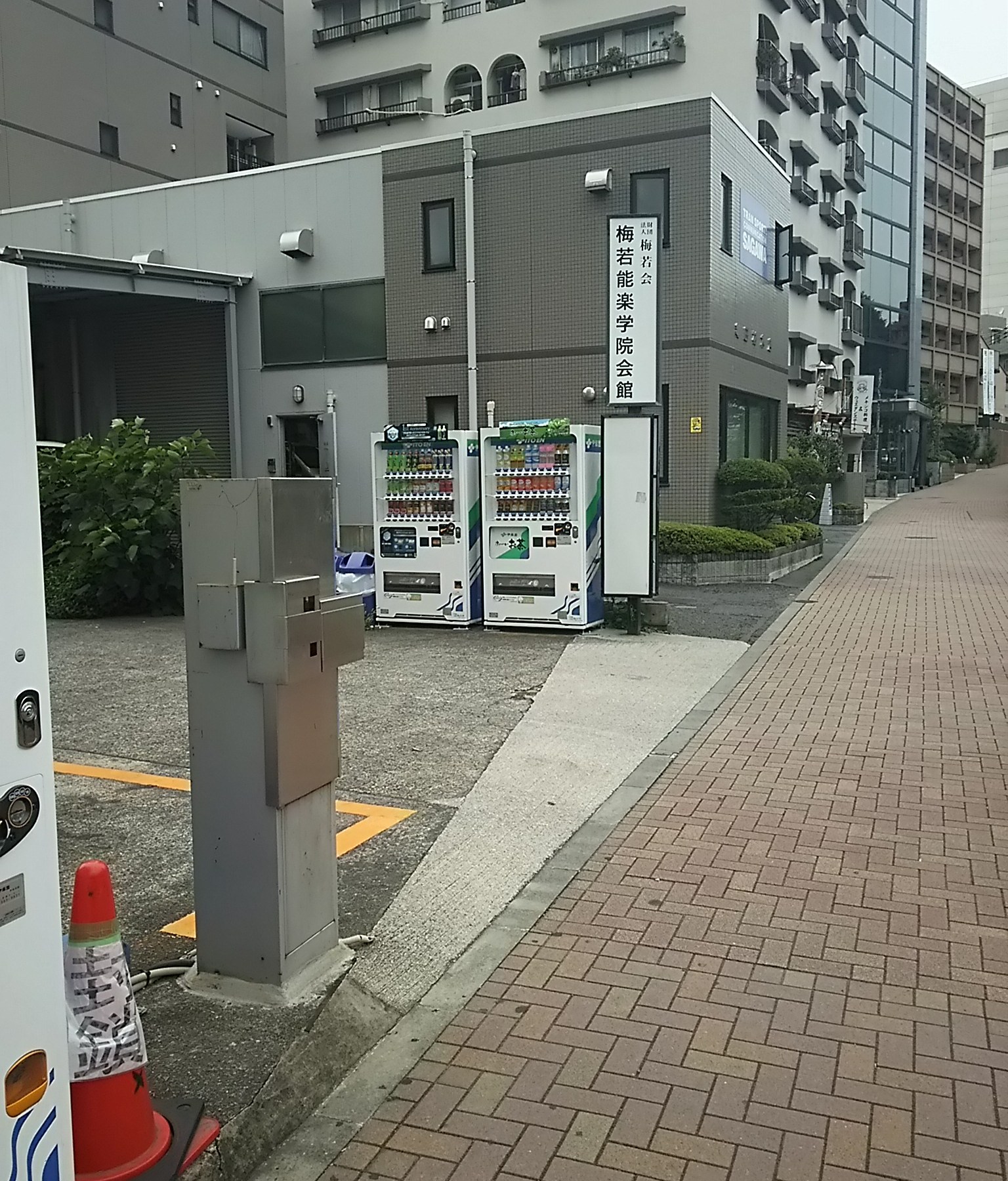 Next to Sagawa Express you will see a parking lot with many vending machines. You can see Noh Theater Hall signs in Japanese Kanji letters “梅若能楽学院会館”.